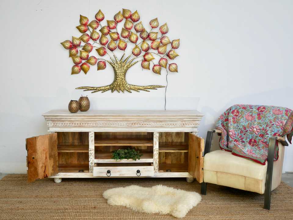 Solid Mango Wood TV Sideboard Hand Carved Unique Patterns Two Doors One Drawer Modern Design for Home Furniture Kitchen Outdoor