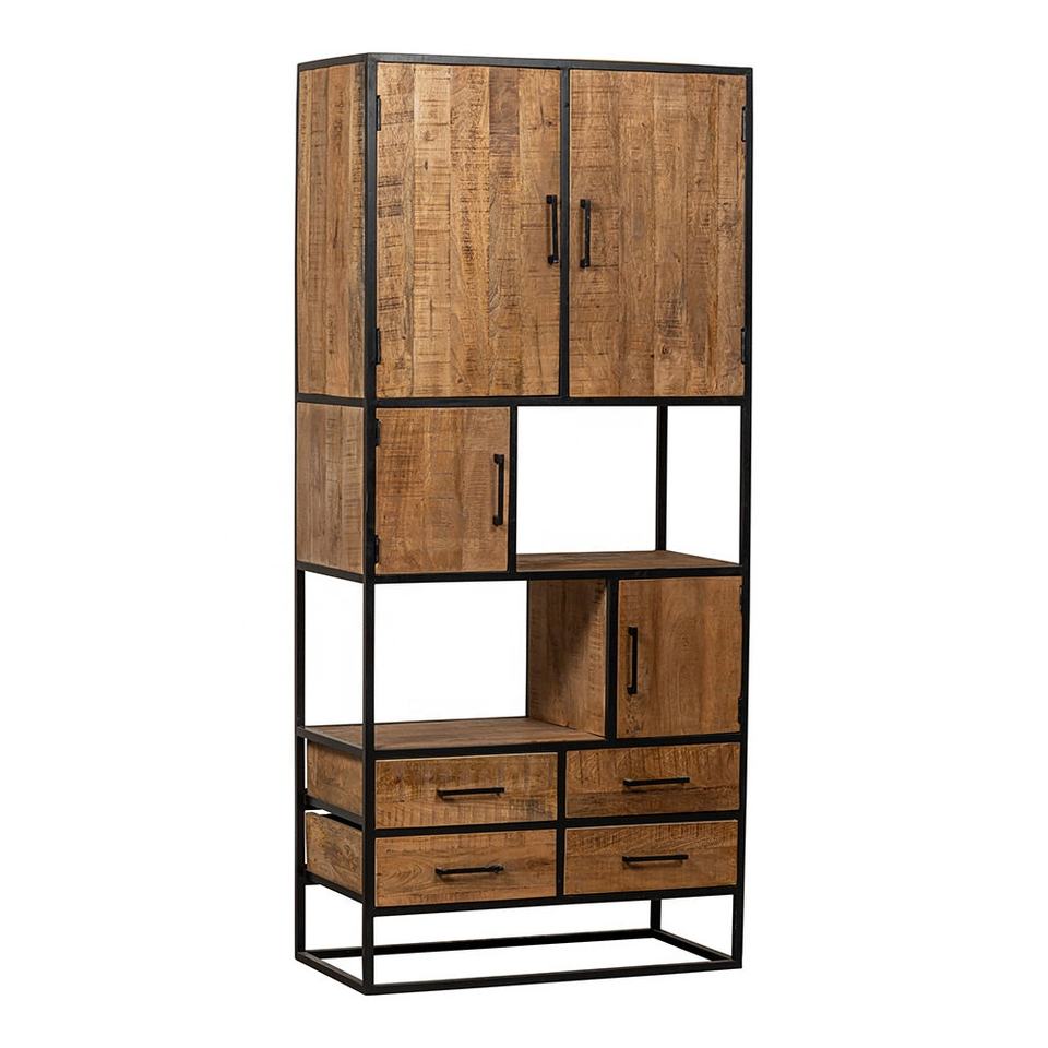 Solid Mango Wood Wall Bookcase Open Shelves 4 Drawers 2 Wood Storage Boxes Natural Rough Finish Iron Tall for Dining Home Bar