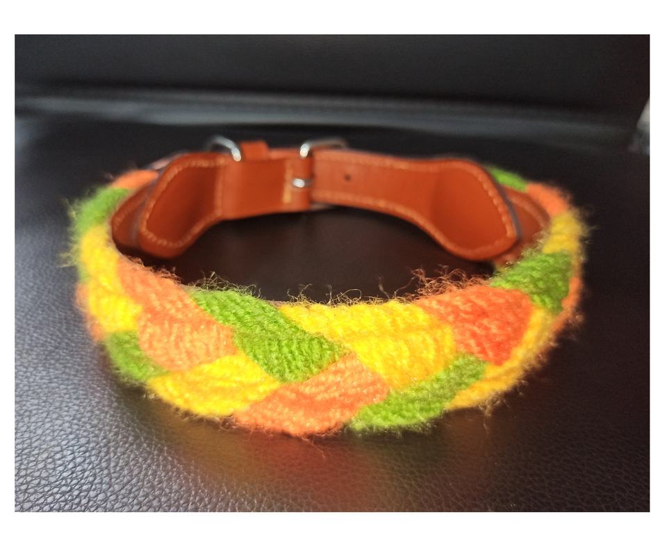 Solid Pattern Brown Leather Premium Eco-Friendly Fashion Dog Collar Leash Colorful Braided Yellow Orange Threads Indian Pet