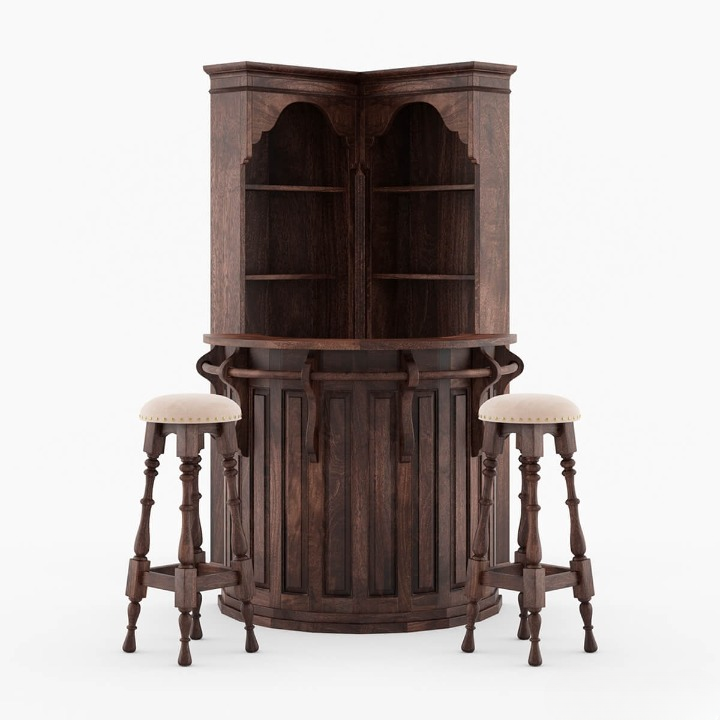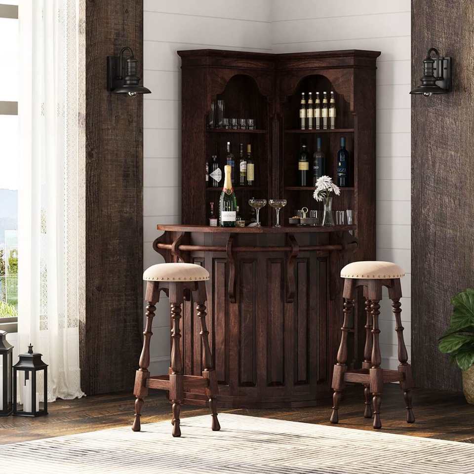 Solid Rustic Teak Wood Corner Home Bar Cabinet Set Upholstered Bar Stools Handcrafted Luxury Interiors Eco-Friendly Durable