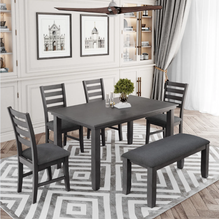 Solid Rustic Wood Dining Room Table and 6 Chairs Bench Set Luxury Farmhouse Home Furniture-Gray