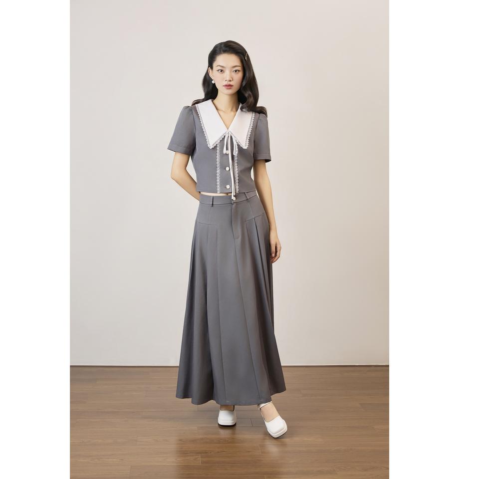 Decoration:White contrast wide collar with lace trimming, Ribbon tie at neckline, Pearlized metal buttons, Panel seams for waist definition