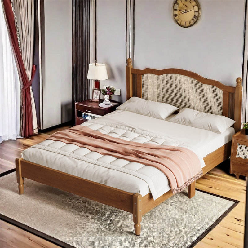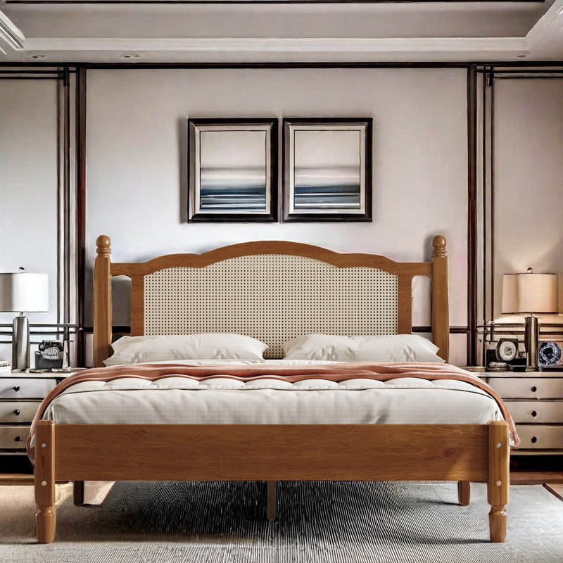 DreamCraft Solid Wood Bohemian Double Bed Frame Natural Rattan Headboard Arc Design Queen Size Mahogany Vietnam
