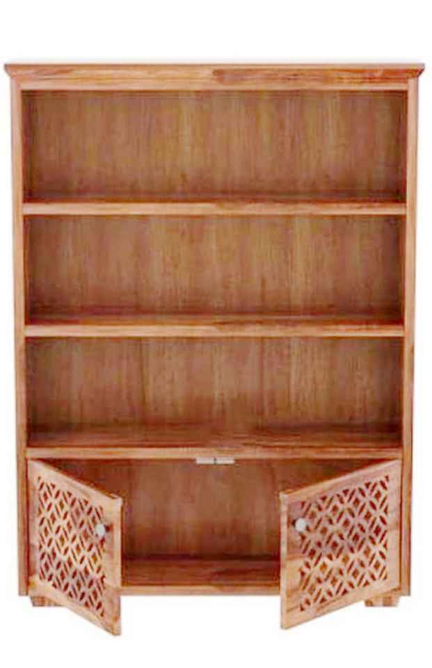 Solid Wood Bookshelf with Carved Doors and Open Shelves for Living Room Display