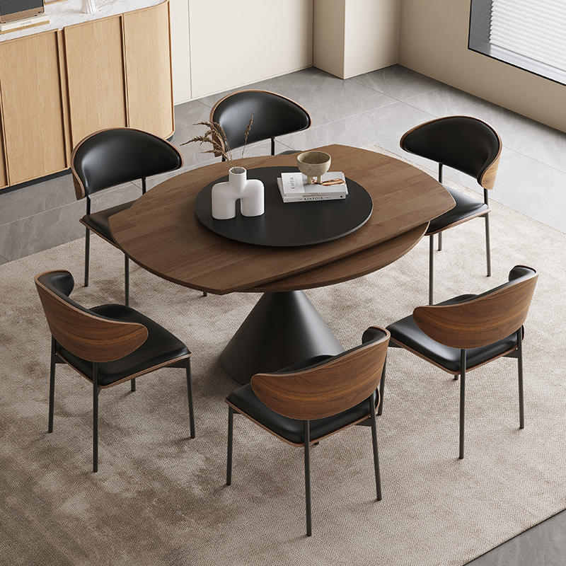 Solid Wood Extendable Dining Table Round Walnut Top Black Base Modern Minimalist Design For Dining Room