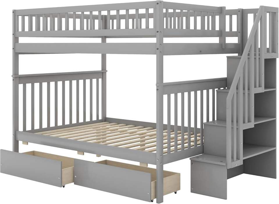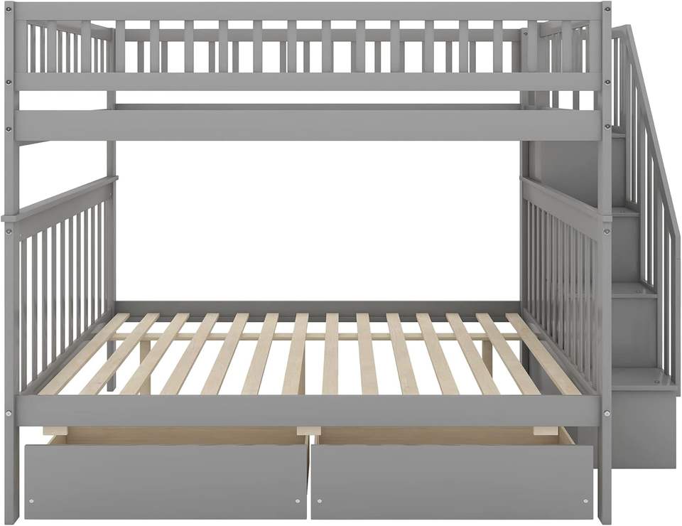 Solid Wood Full Over Full Bunk Bed with Gray Traditional Design Stairs Shelves and Storage Drawers for Space Saving