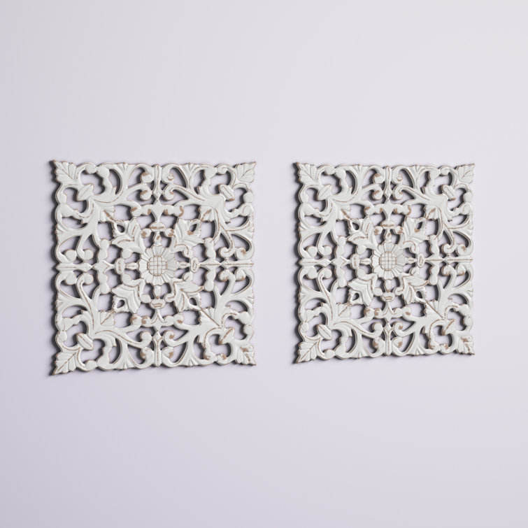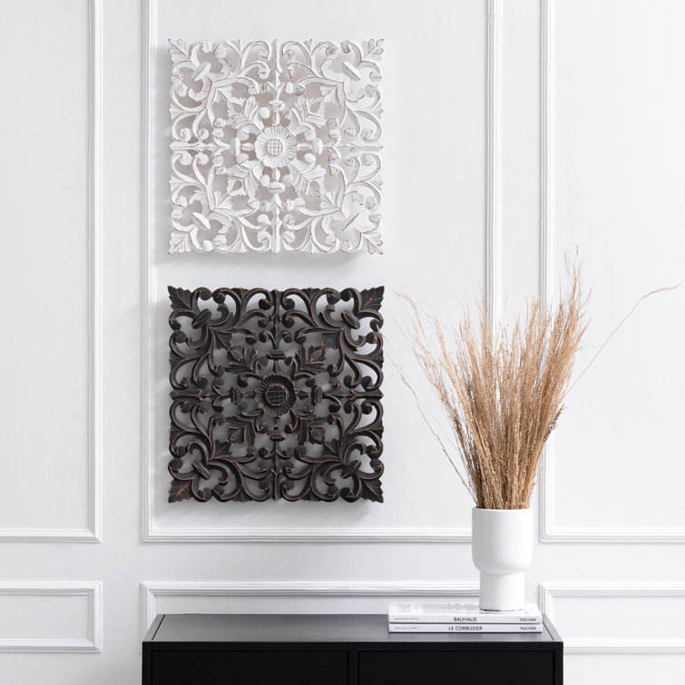 Solid Wood 2-Piece Hand-Carved Rustic Medallion Wall Decor Art Deco Farmhouse White Washed for Living Room Bedroom Wall Hangings