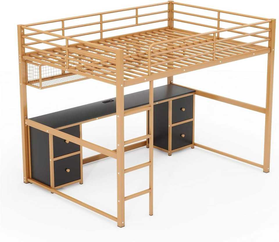 Solid Wood Loft Full Bed Frame with Desk, Drawers & Storage Shelves – Built-In USB Charging Station, Space-Saving Design