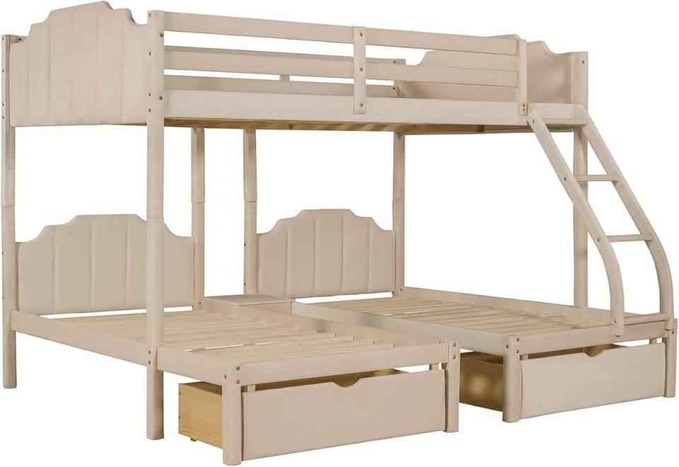 Solid Wood Traditional Design Full over Twin & Twin Bunk Bed Velvet Triple Bunk Bed with Drawers and Guardrails