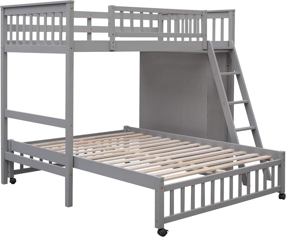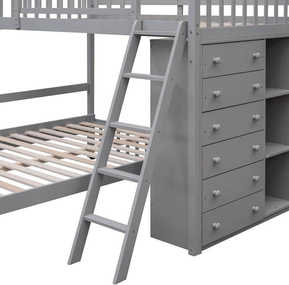 Solid Wood Traditional Style Twin Over Full Bunk Bed with Six Drawers Flexible Shelves & Removable Bottom Wheels-Gray Color