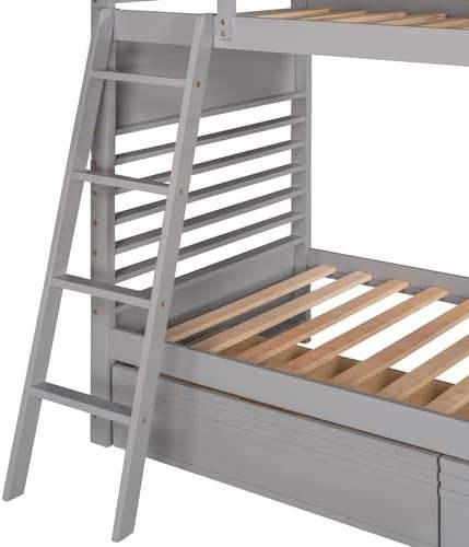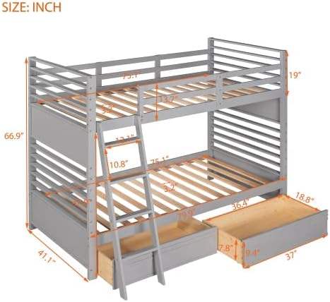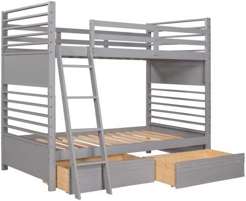 Solid Wood Twin/Twin Bunk Bed Guardrails 2 Storage Drawers Convertible for Children Teens Adults Stylish Gray Space Saving