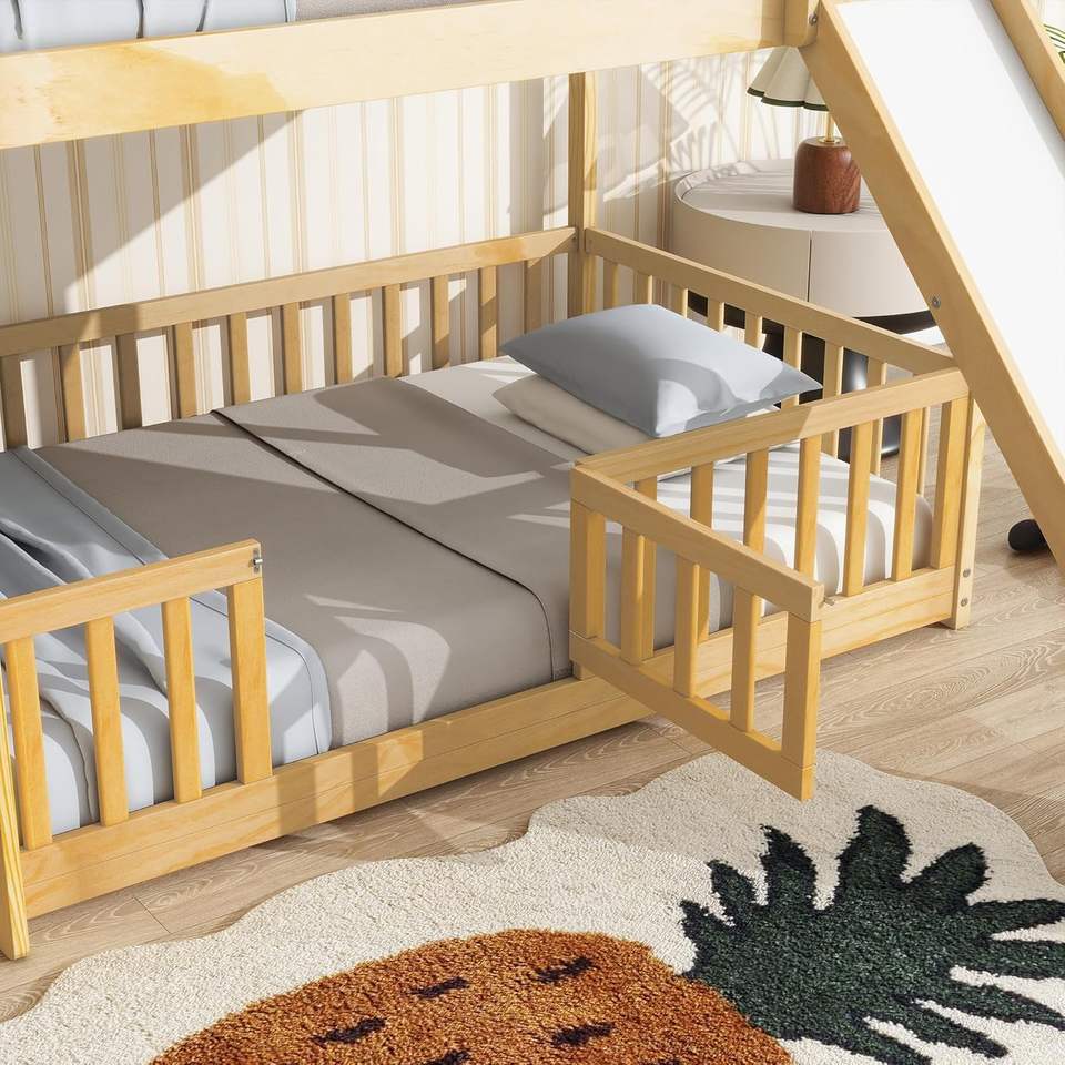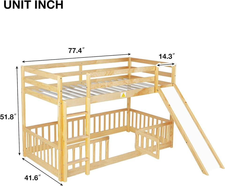 Solid Wood Twin over Twin Bunk Bed Frame with Slide Fence Low Floor Design for Space Saving Traditional Style Natural Wood Color