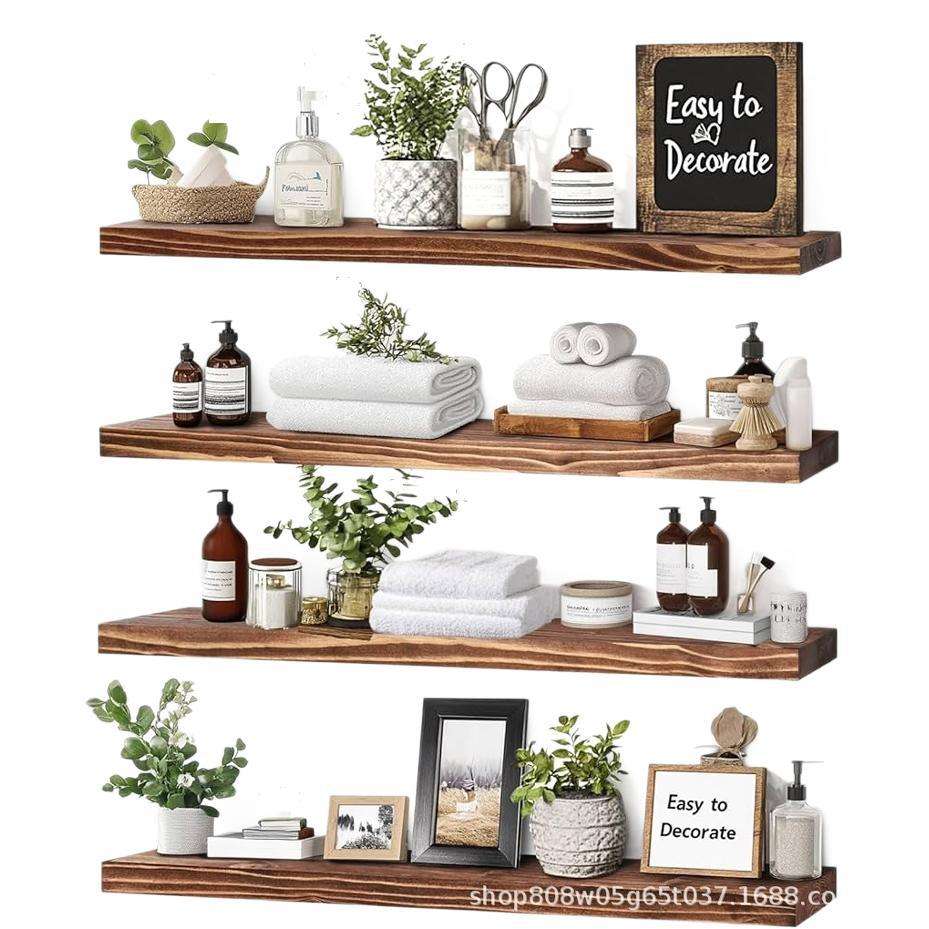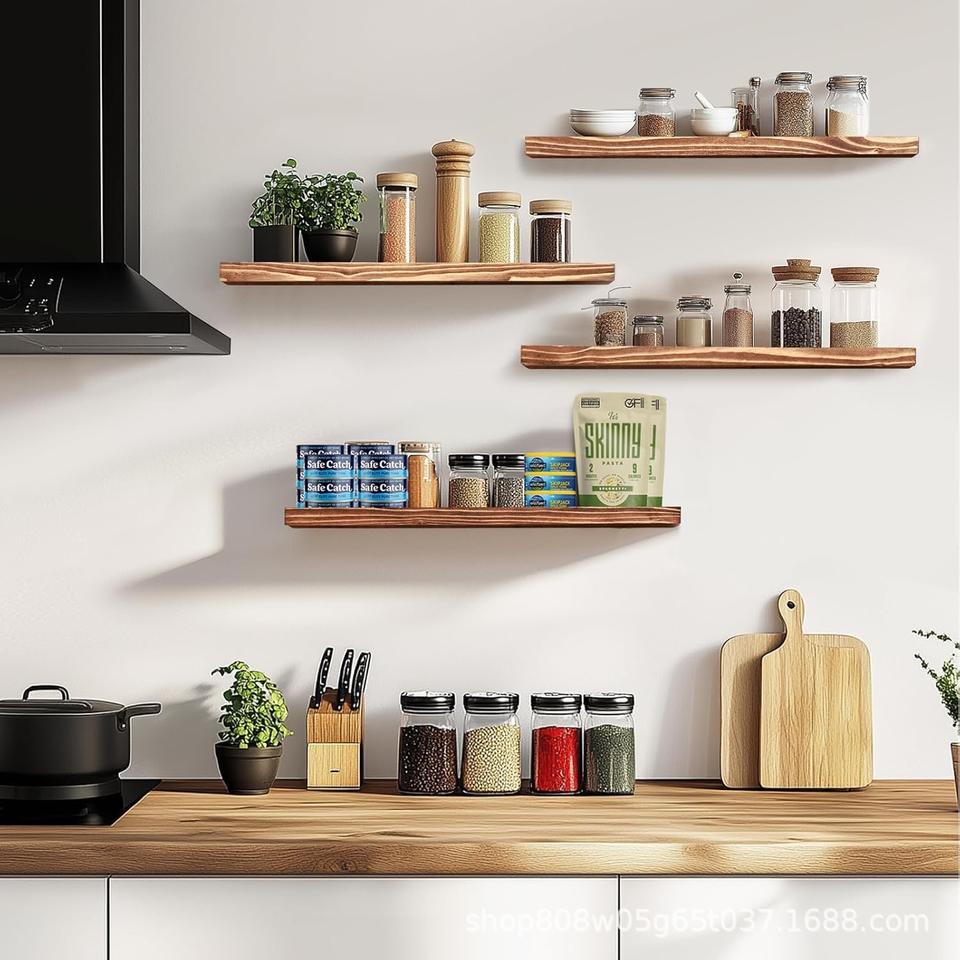 Solid Wood Wall Mounted Shelf 4 Layers Kitchen Storage Rack Rectangle Shape Screw Embedded Installation Neatening Organize