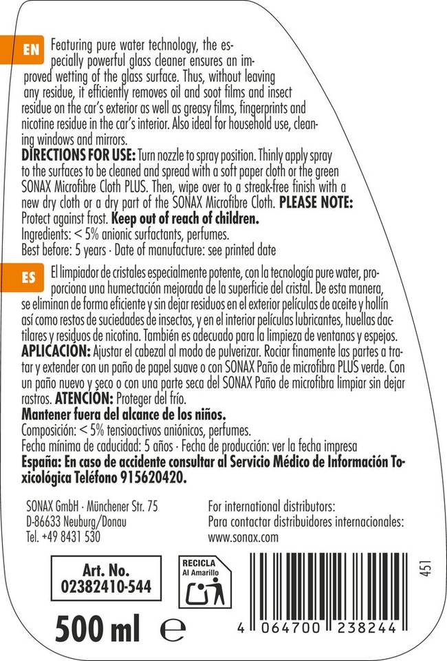Sonax Xtreme Glass Clear 500ml With Demineralized Water For Residue-Free Interior And Exterior Cleaning Car Windshield Cleaner
