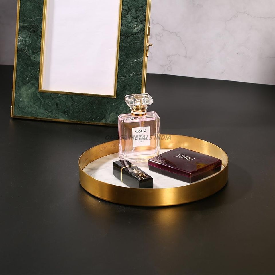 Sophisticated Gold Round Serving Tray with Marble Base Perfect for Organizing Perfumes and Adding Elegance to Any Space