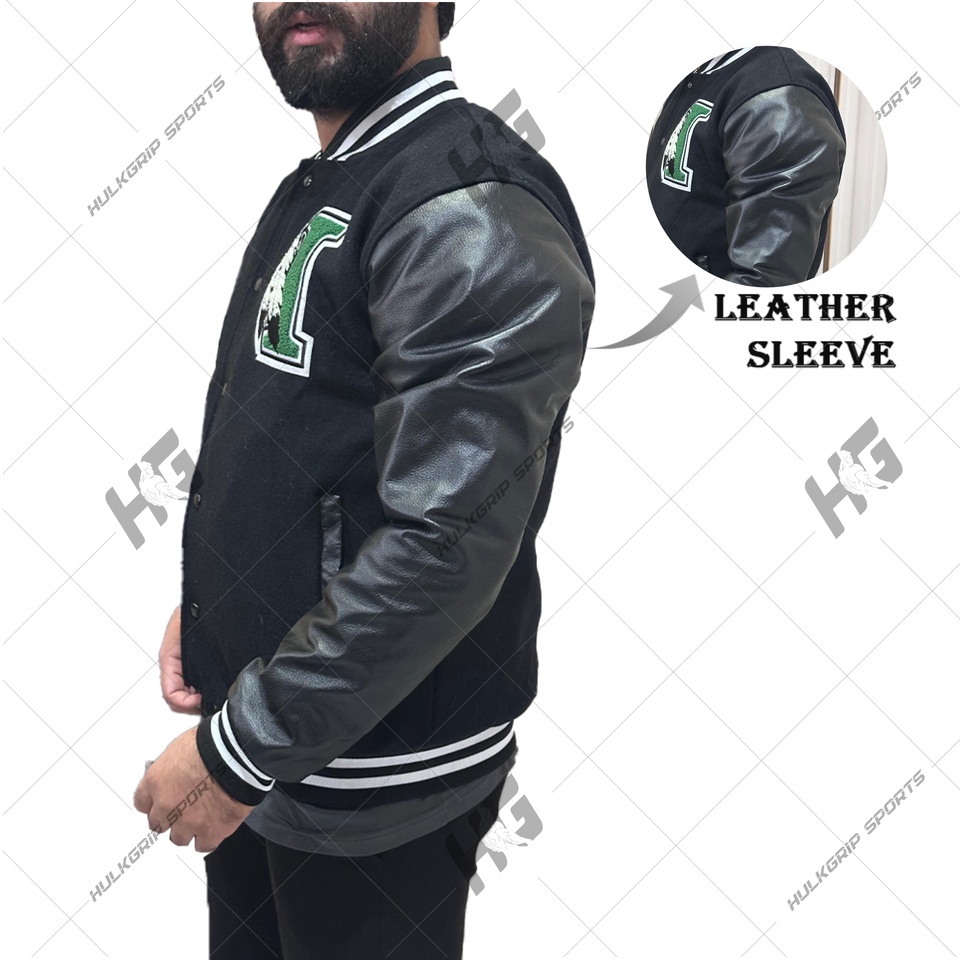 Sorority Black Wool And Black Arm leather Custom Brand And Sorority College Baseball jacket for men