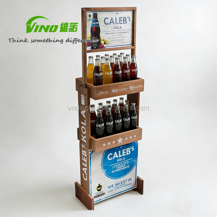 Multi-Tier Wooden Beverage Rack with Signage Space-Saving supermarket display shelves floor standing spice rack
