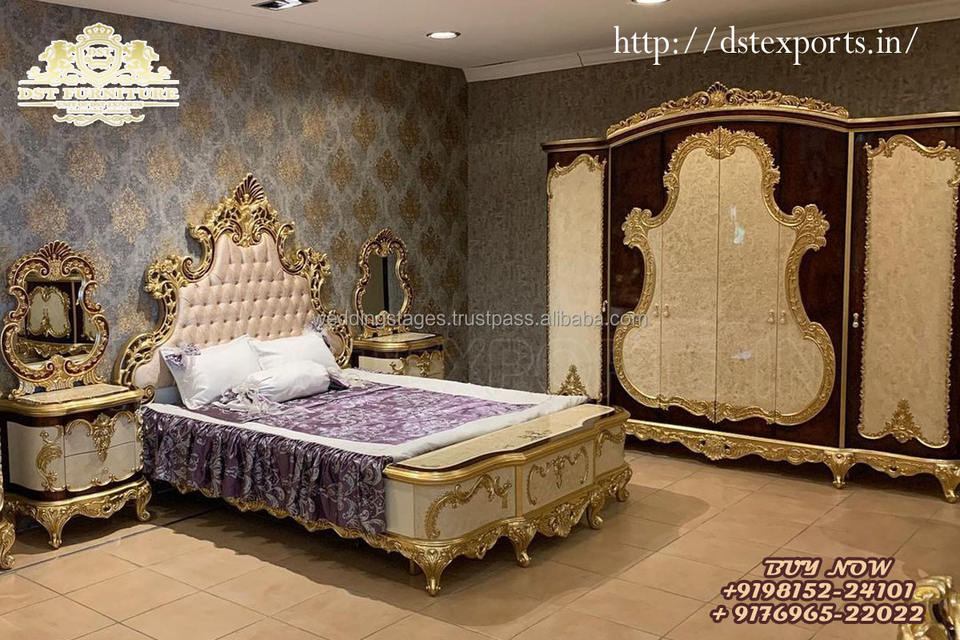 Special Queen Size Bed for Princess Cottage Traditional Carved Princess Bed with Side Table White Gold Bedroom Furniture