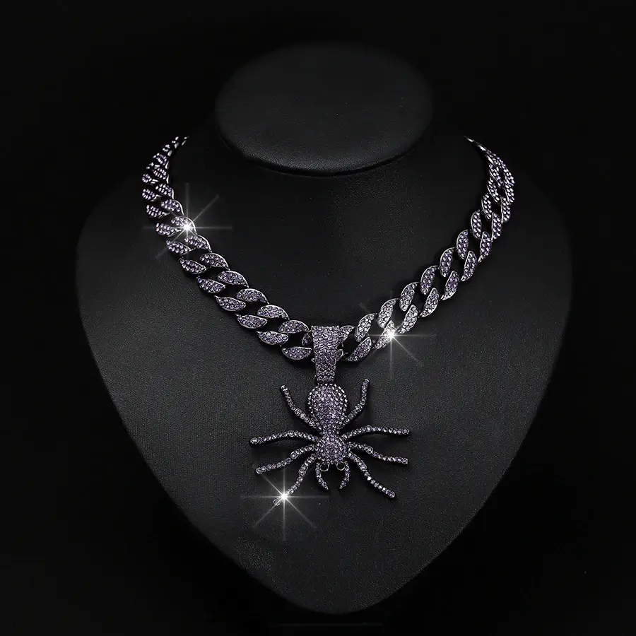 Spider Pendant Hip Hop Jewelry Iced Out Purple Crystal Serling Silver Gold Silver Plated Miami Link Chain Necklace for Party