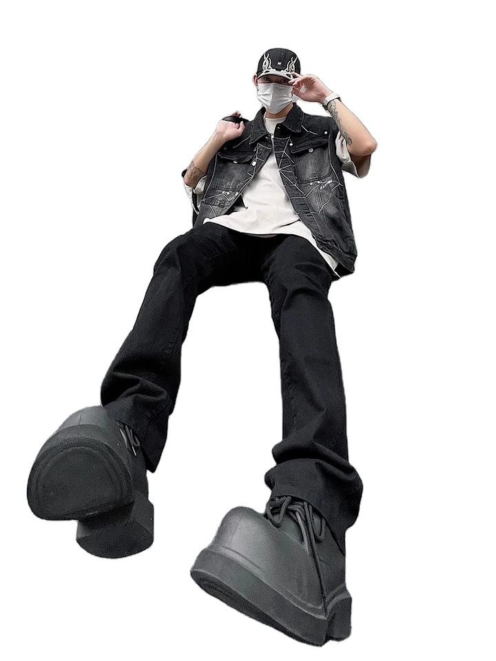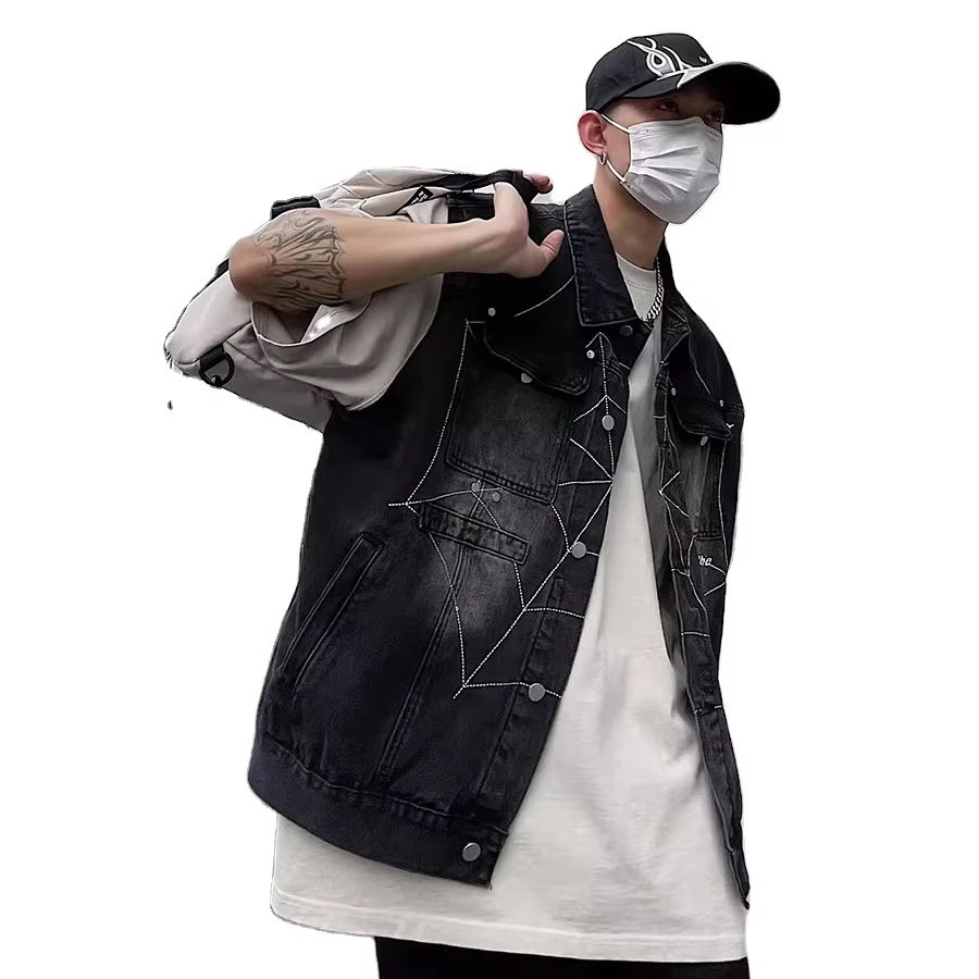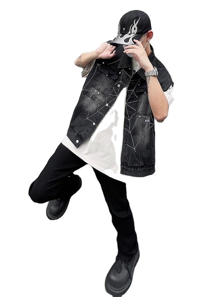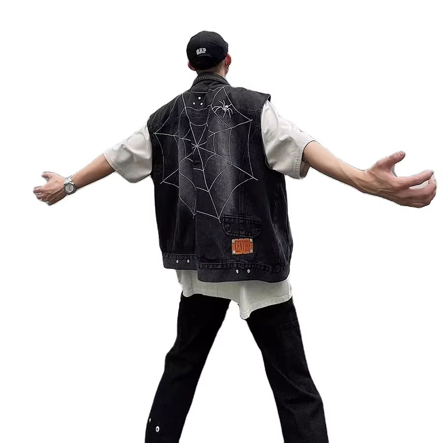 Spider Web Embroidered Denim Jacket for Men Summer Layering Single-breasted Oversize Sleeveless Vest Retro Y2k Streetwear