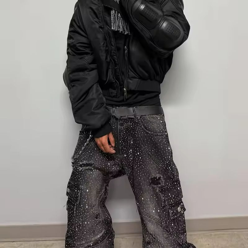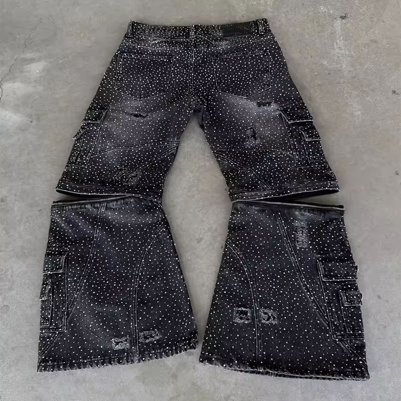 Sportish Impex Manufacturer Custom Vintage Streetwear Flare Rhinestone Straight Wide-Leg Denim Jeans Hip Hop Style for Men