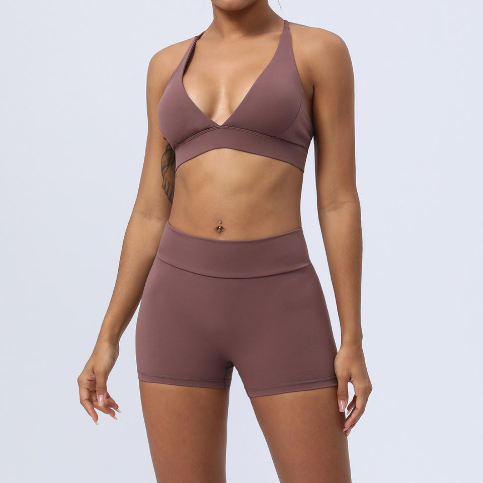 Women's Sportswear Gym Set Compression Stretchy Plaid Fitness Shorts Bra Soft Scrunch V Back Design Customizable Logo Breathable