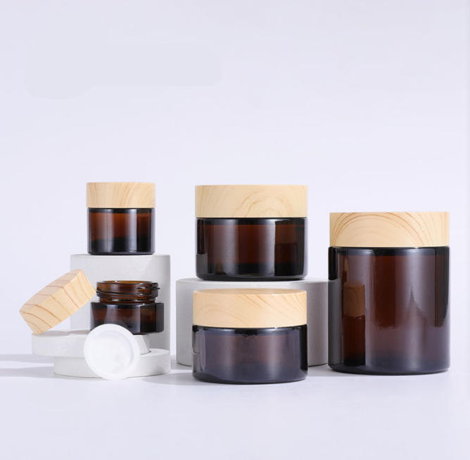 Spot Wholesale 5g 10g 15g 20g 30g 50g Amber Face Cream Jars Plastic Wood Grain Lids And Glass Container