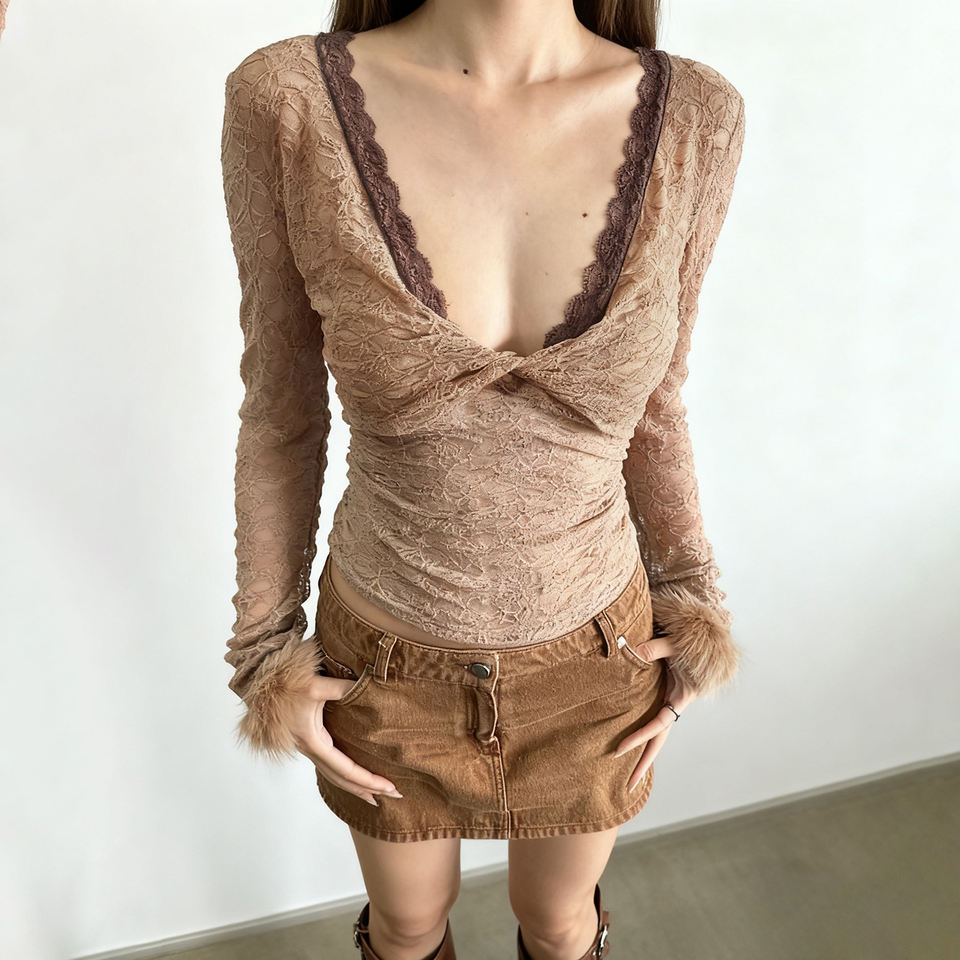 Spring 2026 Women Slim Fit Short Lace See Top Deep V Neck Stretchy Knit Long Sleeve Feather Trim Elegant Chic Feminine Blouse