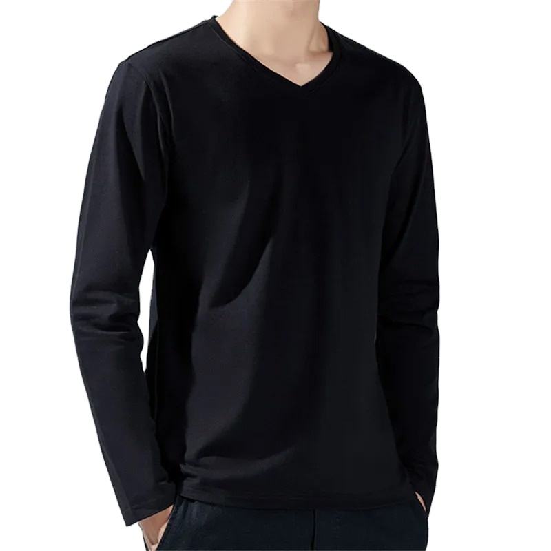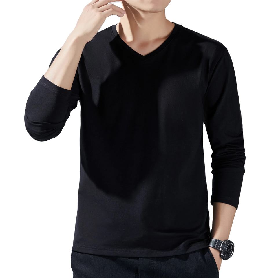 Spring Autumn Cotton V-Neck T-Shirt Men Long SLeeve Korean Style Casual T Shirts Men's Solid Slim Tees Tops Male Clothing