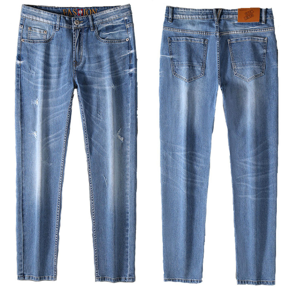 Spring Men's Denim Jeans Slim Straight Stretch with Blue Long Pants Casual Style with Fashionable Patchwork Pattern