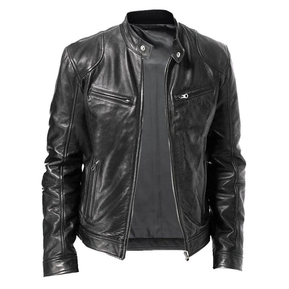 Spring Men's Stand-up Collar Slim Full Grain Leather Jacket Zipper Pocket PU Coat Biker Men Clothes Casual Male Top Quality