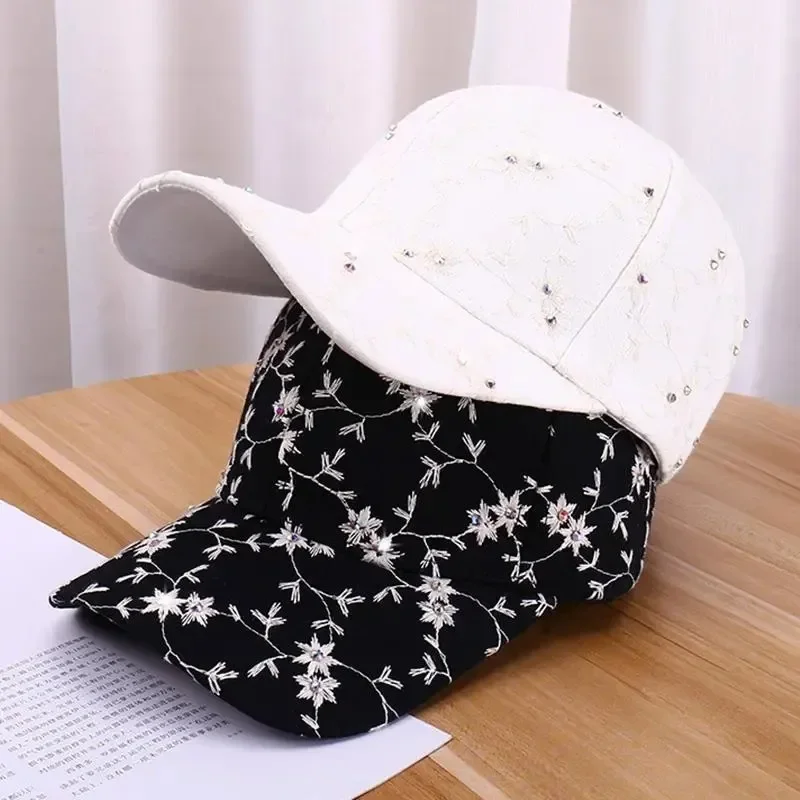 Spring Summer Rhinestone Embroidered Flower Baseball Cap Korean Fashion UV Sun Hat Casual Stylish