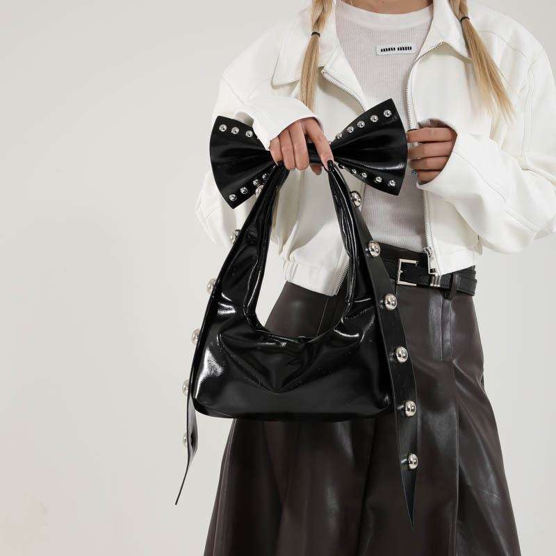 Spring Trendy Fashion Women's Zippered Handbag Cool Girl Style Rivet Decoration Autumn Season Studded Bow Underarm Bag Made