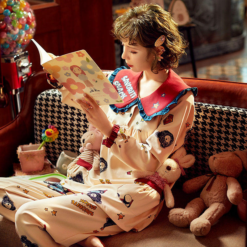 Spring and Autumn Cotton Pajamas Women's Long Sleeve Thin Two-Piece Set Lace Large Lapel Knitted Fairy Home Clothing OEM