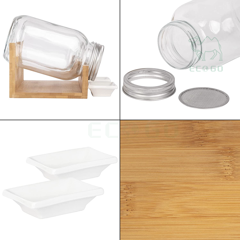 Sprout Glass Set with Draining Rack Made of Bamboo and Sieve Lid Made of Stainless Steel and Ceramic Drip Trays