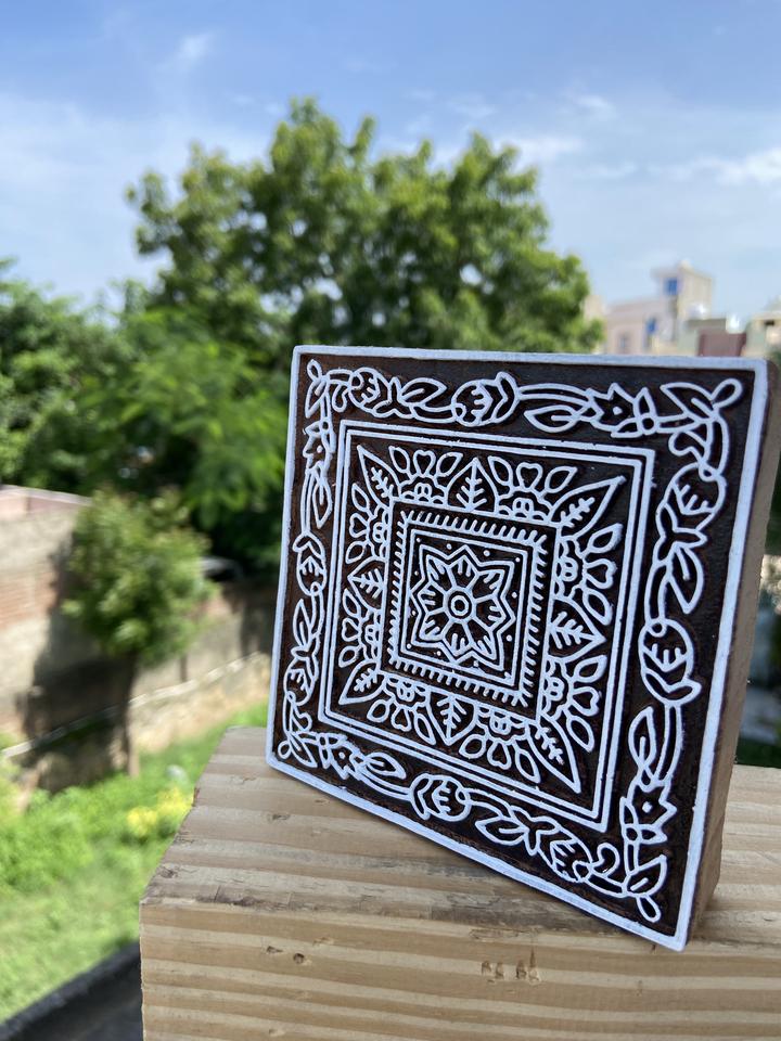Square Floral Border Hand Carved Wooden Block for Textile Printing White Engraving Design for Best Price