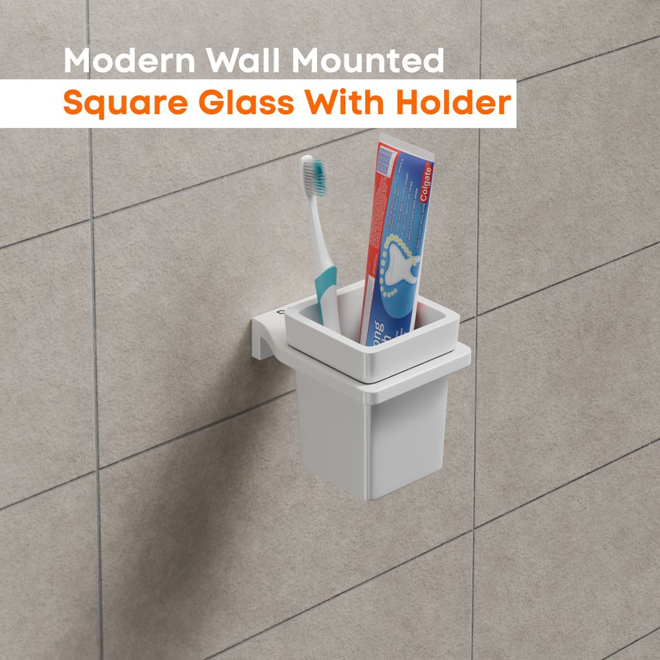 Square Glass Tumbler with Wall Mounted Brass Holder Toothbrush and Rinse Cup Set for Luxury Bathroom Vanity Organization