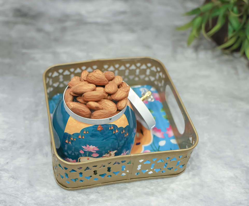 Square Pichwai Handcrafted Metal Tray & Match Jar | Indian Diwali Wedding & Housewarming Gift Set | Modern Design Luxury Gift