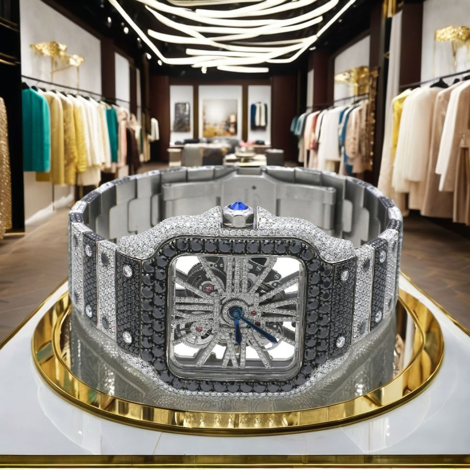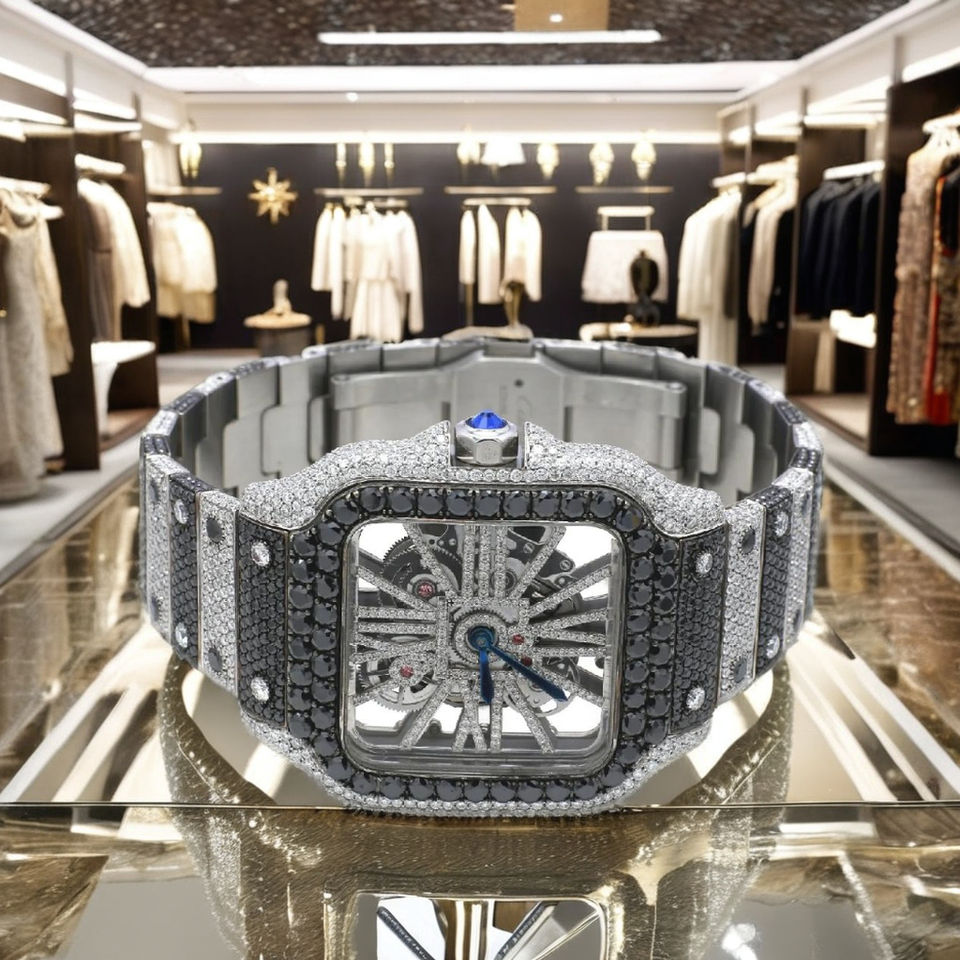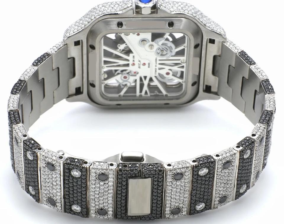 Square Skeleton Mechanical Watch Fashion Modern Stainless Steel Fully Iced Diamond Black Stone Bezel Luxury Hip Hop Vintage Glas