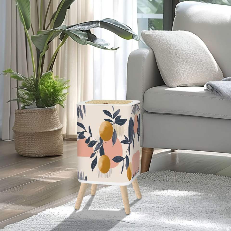 Square Trash Can with Lid 2.6 Gallon/10L Modern Floral Pattern Halftone Geometric Pink Waste Bin Pop-Up Lid Wood Legs in Stock