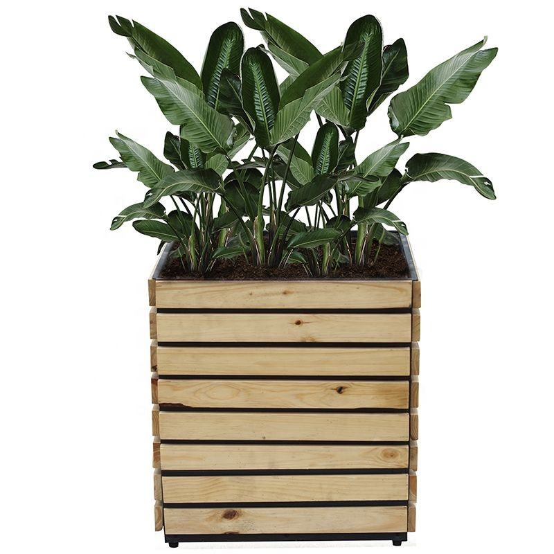 Square Wood Planter Box Flower Pot With Powder Coated Steel Frame for Hotel, Balcony Decoration, Outdoor Gardening