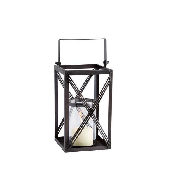 Square iron candle lantern with tall stature and large glass panels suitable for floor setups or event entrances