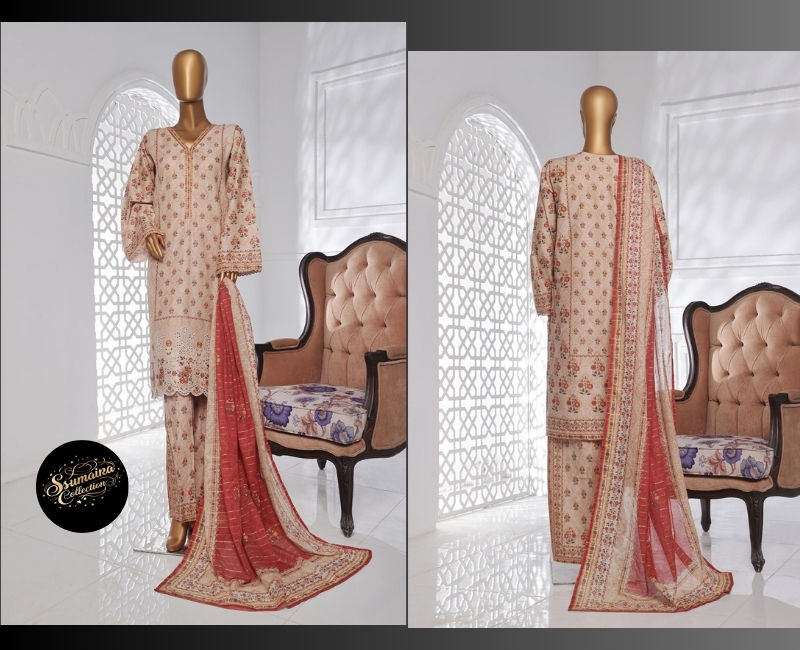 Ssumaira Collection`s Chikenkari With Farshi Shalwar & Print Fancy Lawn Dupatta 3 PC BINSAEED Brand