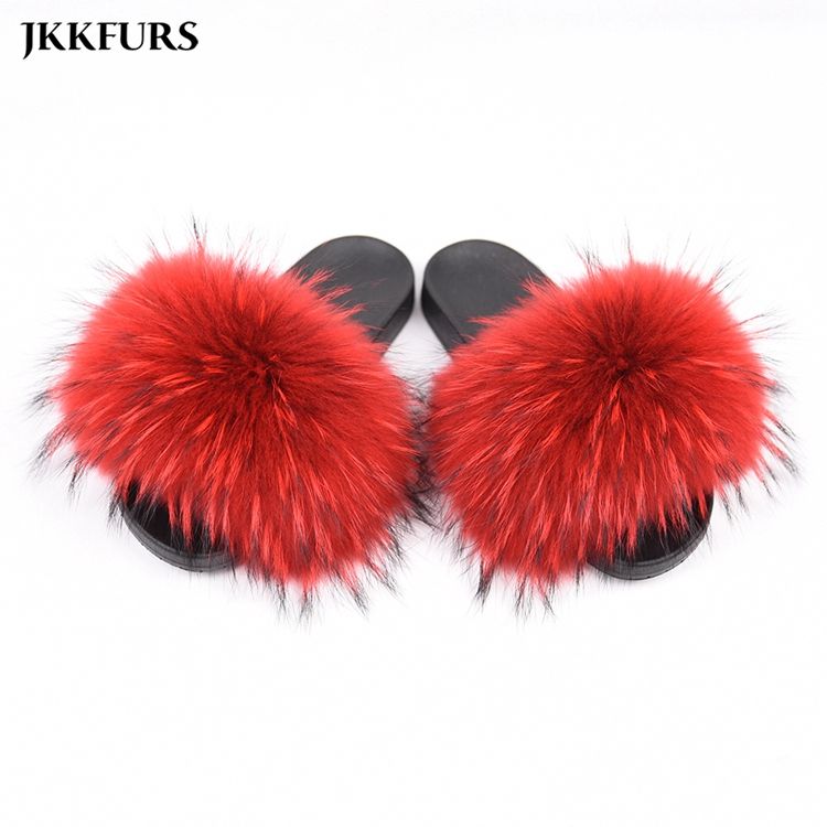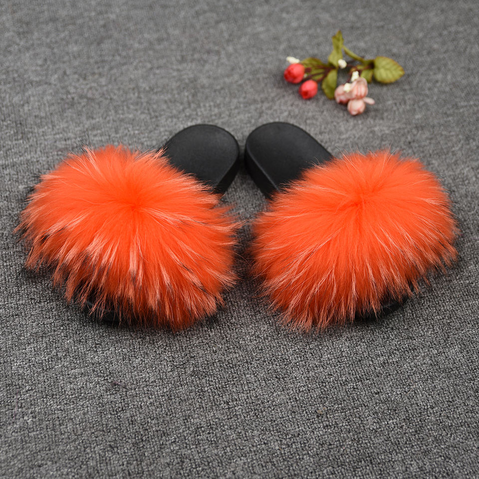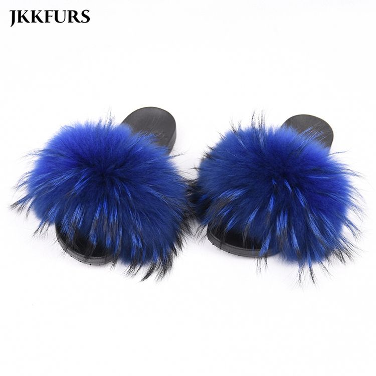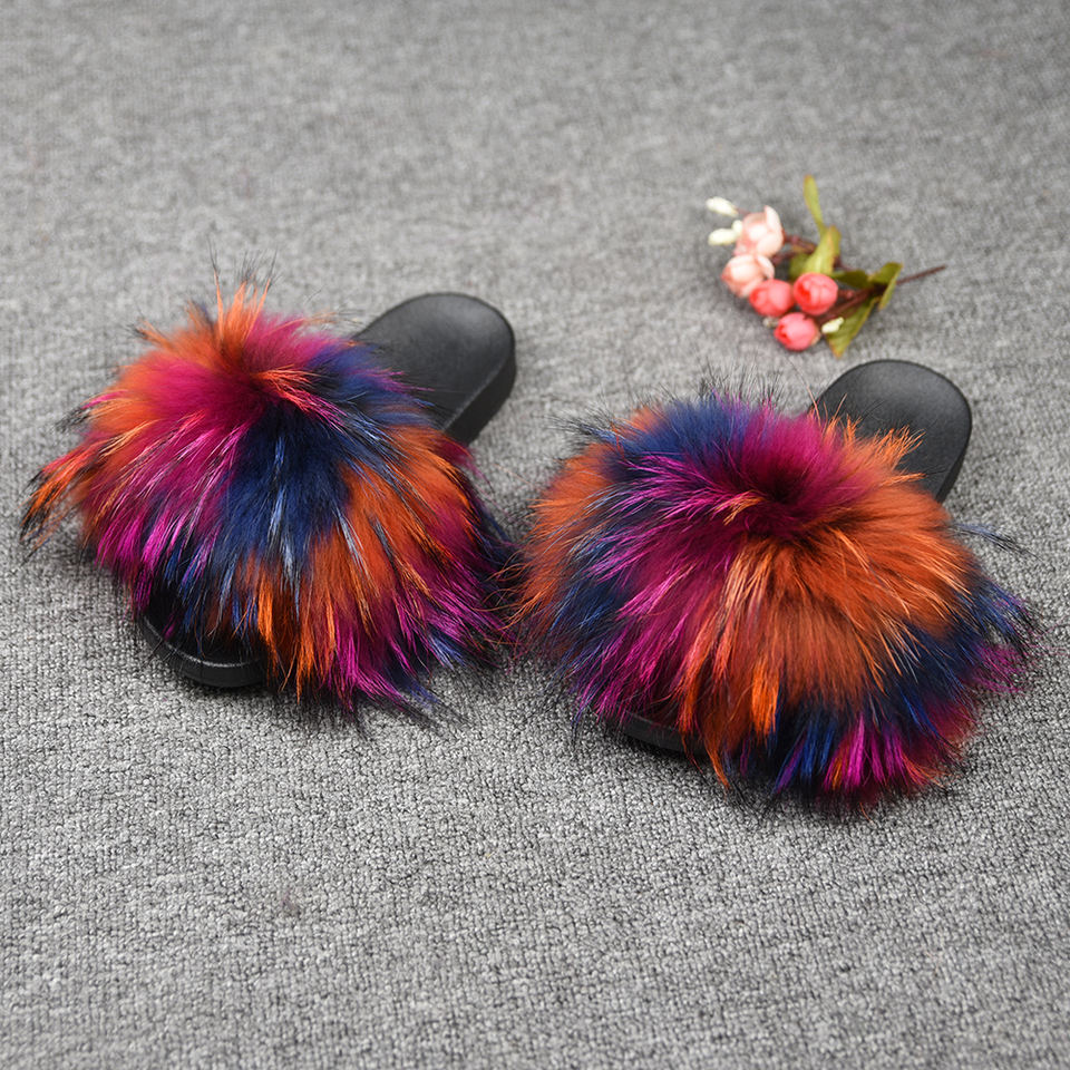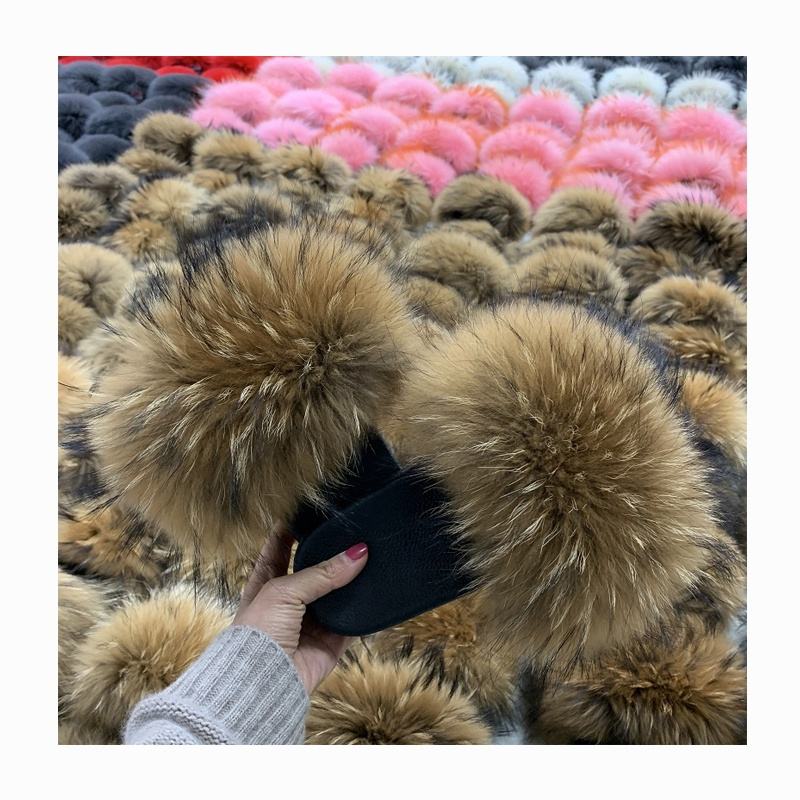 Stable Quality Real Raccoon Fur Soft Slides Natural Color Fluffy Fur Slippers Slides for Women
