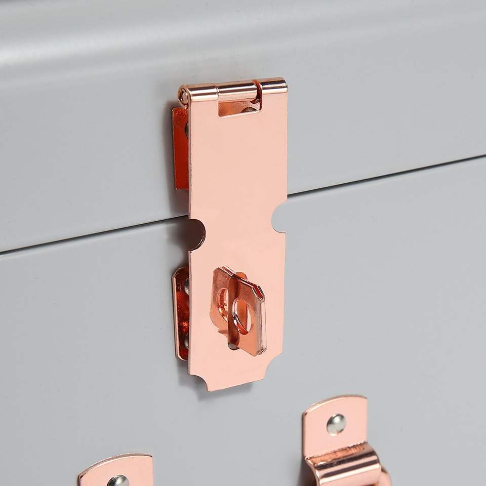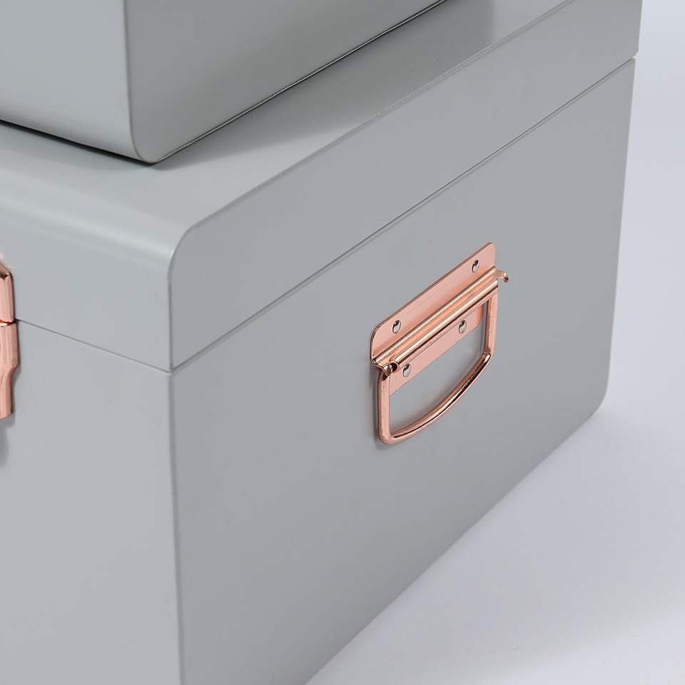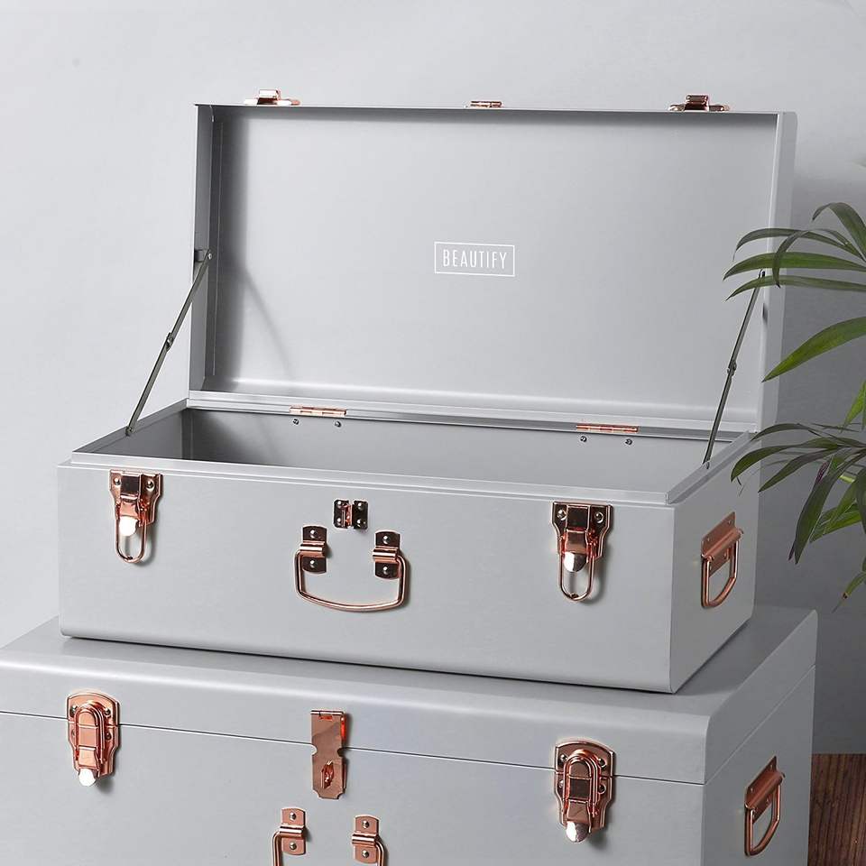Stackable Steel Storage Chests Grey and Rose Gold Trunk Set Large Decorative Lockable Boxes for Blankets Linens and Memories