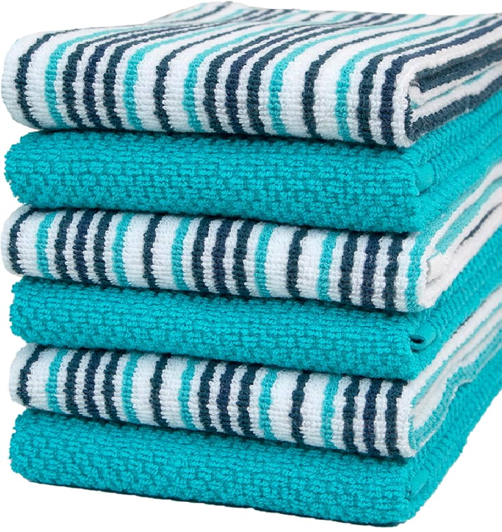Stacked microfiber cotton kitchen towel set in bright teal, white, and navy stripes, available at wholesale prices.