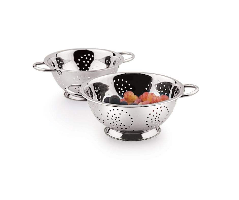 Stainless Steel Colander Heavy Duty Handles Self-draining Solid Ring Base Chrome Finish Dishwasher Safe Mirror Polish