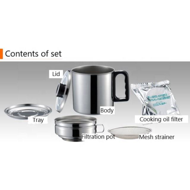 Contents of set:Body, lid, mesh strainer, filtration pot, tray, cooking oil filter