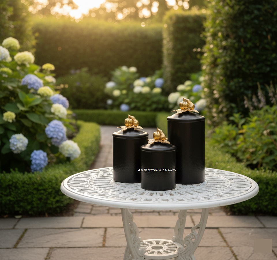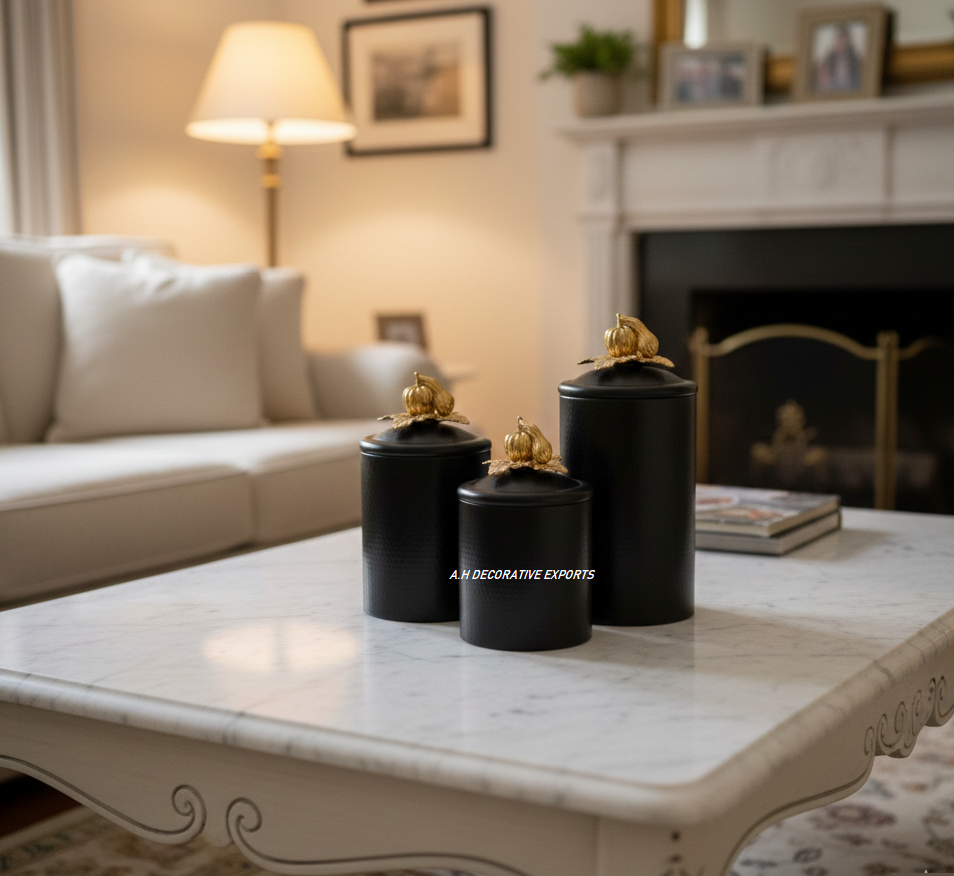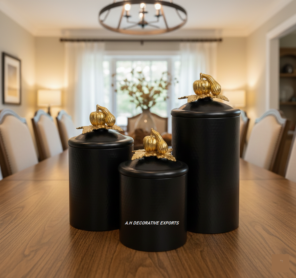 Stainless Steel Europe Style Handcrafted Eco-Friendly Artistic Pumpkin Food Storage Canister Set Black Finish with Gold Top