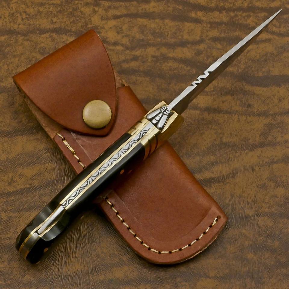 Stainless Steel Utility Folding Knife Back Lock Bull Horn Handle Leather Sheath Pocket EDC Hunting Camping Industrial Grade ODM